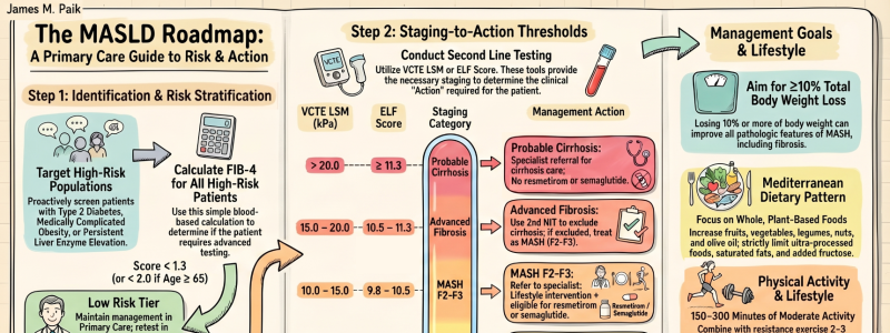 Central to this paradigm shift is a fundamental principle: fibrosis risk, rather than steatosis alone, should guide clinical decision-making. Patients with type 2 diabetes, medically complicated obesity, persistent aminotransferase elevation, or multiple cardiometabolic risk factors warrant active risk stratification using first-line noninvasive testing with FIB-4. This approach enables primary care clinicians to rapidly distinguish low-risk patients suitable for routine management from those requiring further assessment and potential specialist referral.