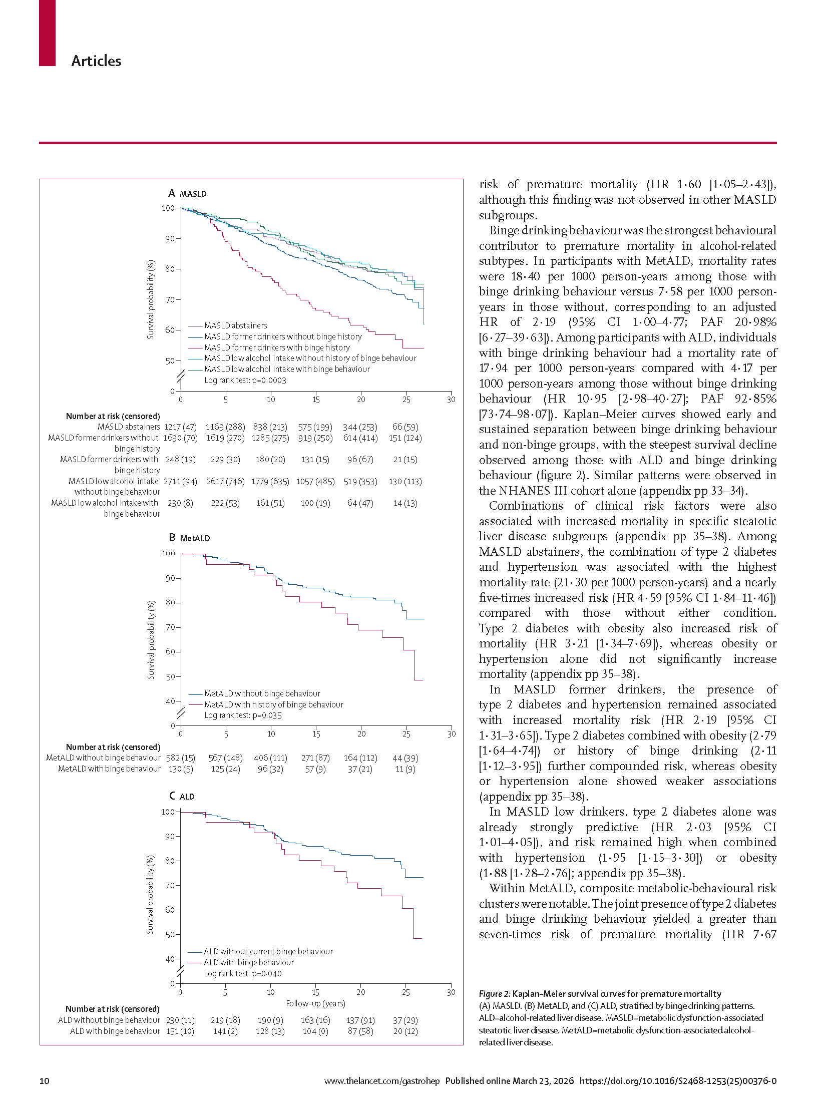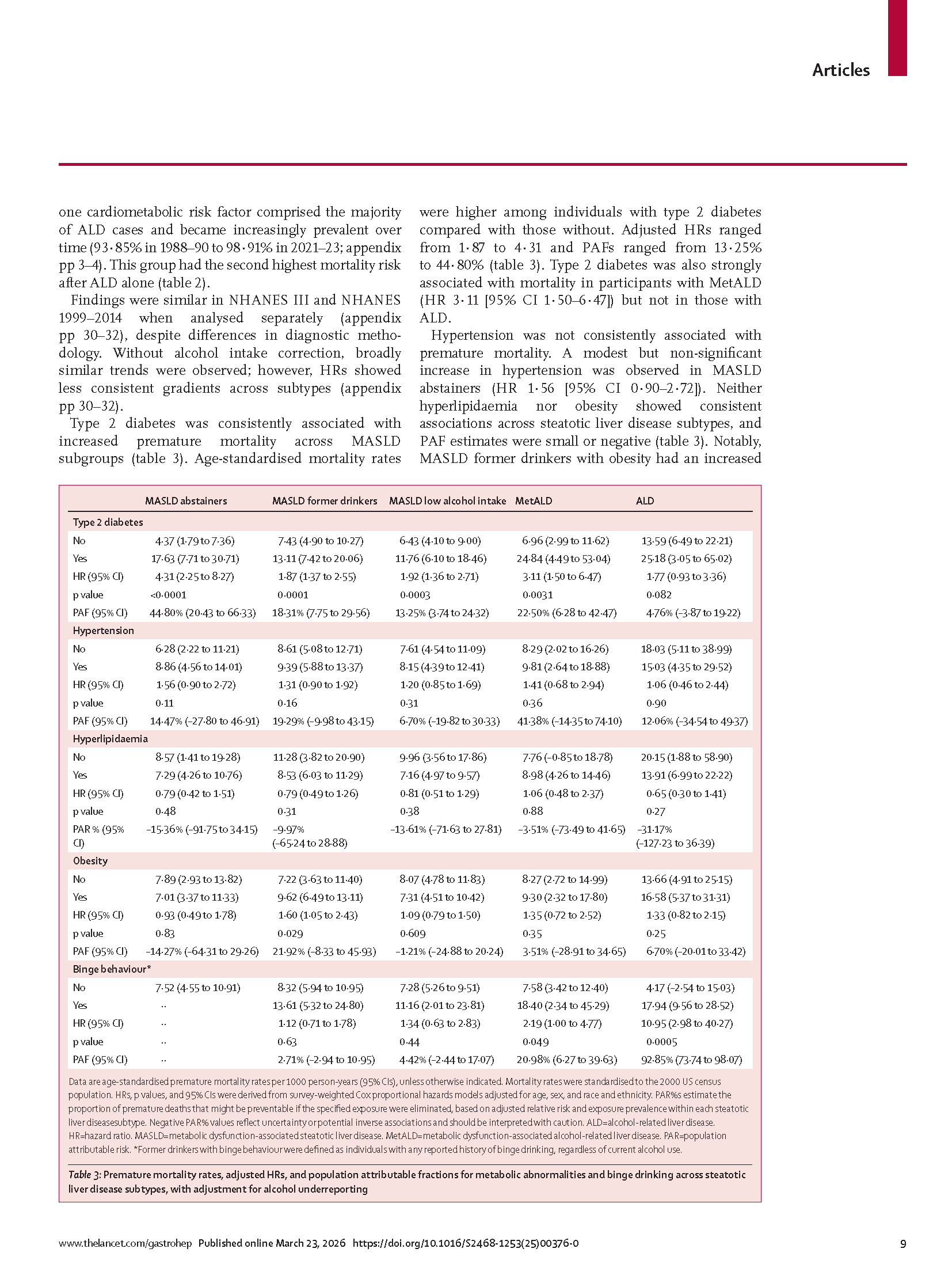 The mortality signal is striking. Binge drinking drives most premature deaths in ALD at 92.9 percent and contributes significantly in MetALD at 21 percent, while type 2 diabetes remains a major driver in MASLD at up to 44.8 percent. The highest risk occurs when these factors coexist, particularly binge drinking combined with diabetes or hypertension, which is associated with up to a seventeen-fold increase in mortality.